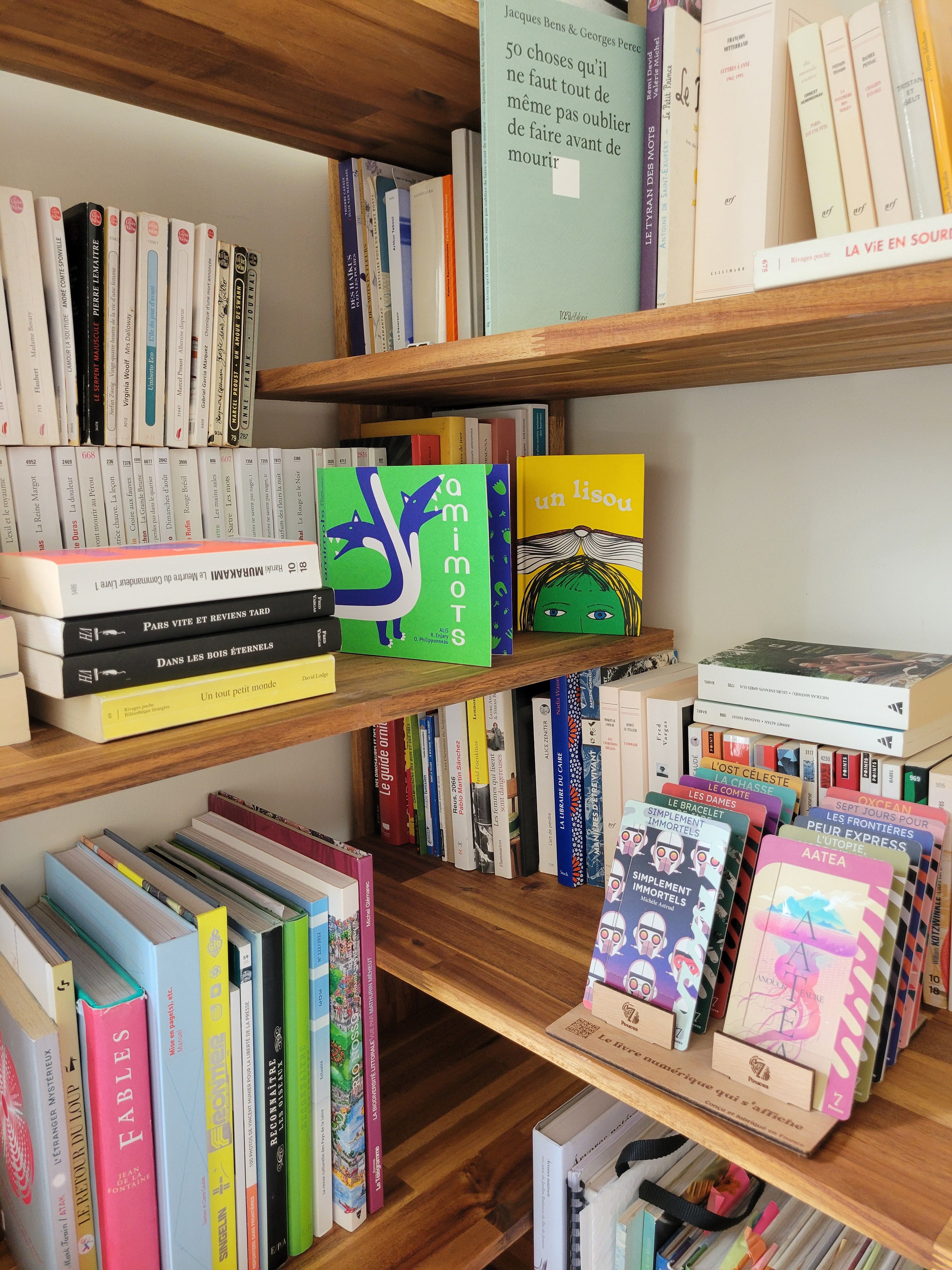 Et même si on apprécie de lire sur smartphone ou sur liseuse, on aimerait afficher nos coup de cœur de lecture, les regarder, se souvenir de l’histoire ou d’un personnage, en regardant la couverture, échanger dessus avec les amis qui passent dans notre salon...
